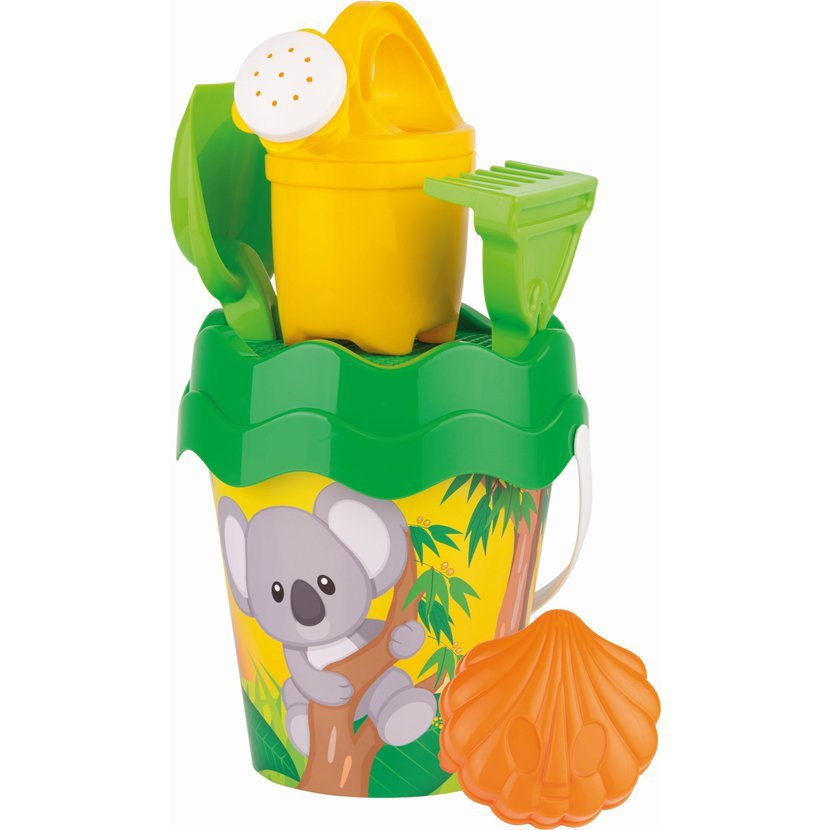 6dílná sada na písek, vyrobená z kvalitních plastů v Itálii. Obsahuje: Kyblík, konvičku 0,5 l, sítko, lopatku, hrabičky a tvořítko ve tvaru mušle. Kyblík: průměr 17 cm, výška 16 cm. Sada: výška 35 cm, váha 0,42 kg. Doporučený věk od 12 měsíců.
