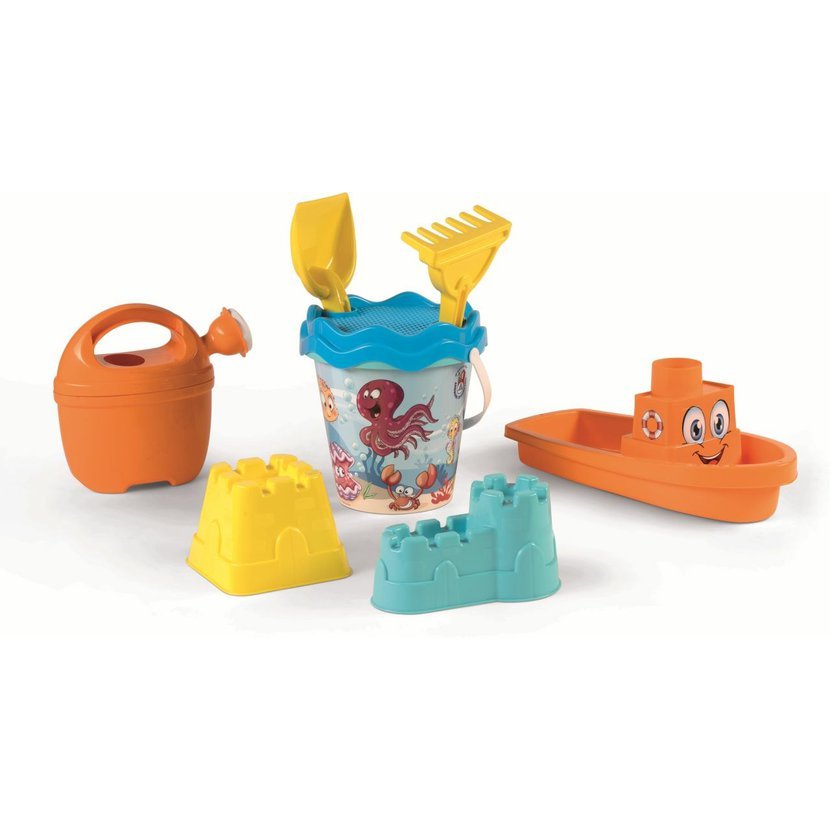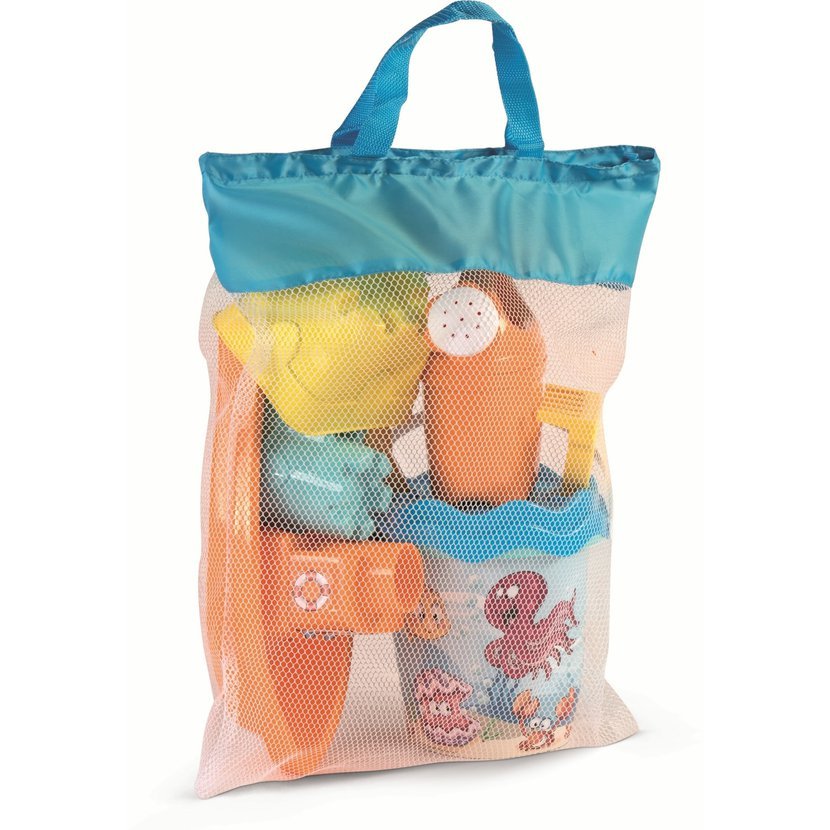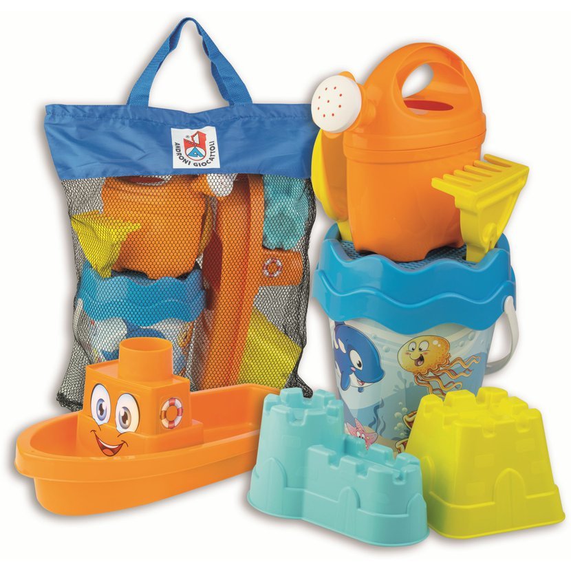 9dílná sada na písek, vyrobená z kvalitních plastů v Itálii. Obsahuje: Kyblík o průměru 17 cm, sítko, konvičku 0,5 l, lopatku a hrabičky, dvě tvořítka hradů a loďku. Vše je uložené v praktické cestovní síťované tašce. Rozměry balení: 34 x 18 x 44 cm ( s x š x v). Váha sady: 0,78 kg. Doporučený věk od 12 měsíců.