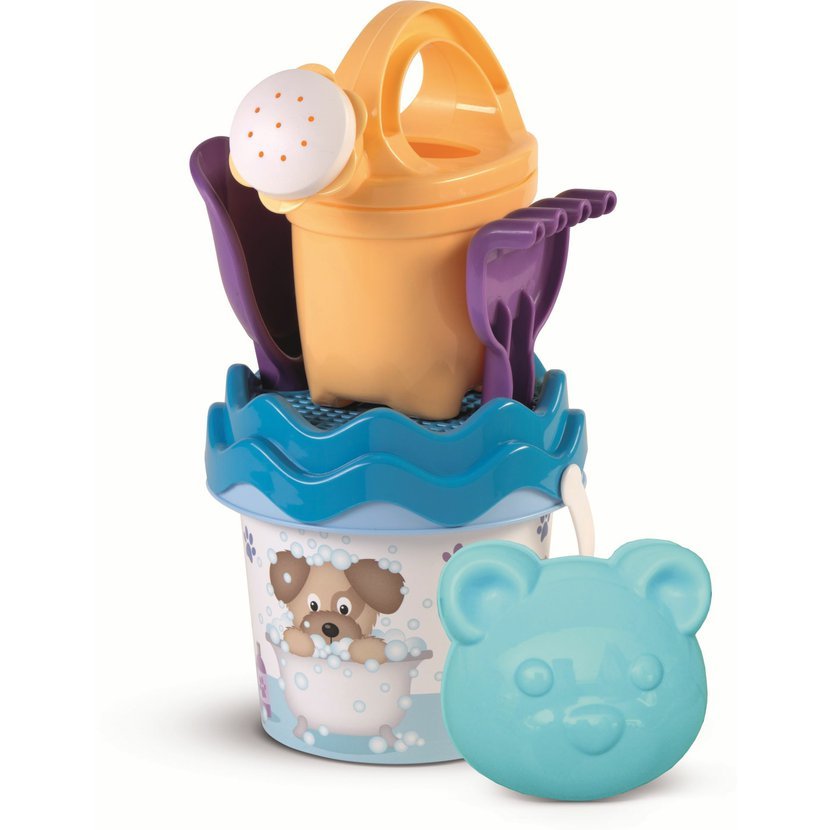 6dílná sada na písek, vyrobená z kvalitních plastů v Itálii. Obsahuje: Kyblík, konvičku 0,5 l, sítko, lopatku, hrabičky a tvořítko ve tvaru psí hlavy. Kyblík: průměr 13 cm, výška 11 cm. Sada: výška 29 cm, váha 0,251 kg. Doporučený věk od 10 měsíců.