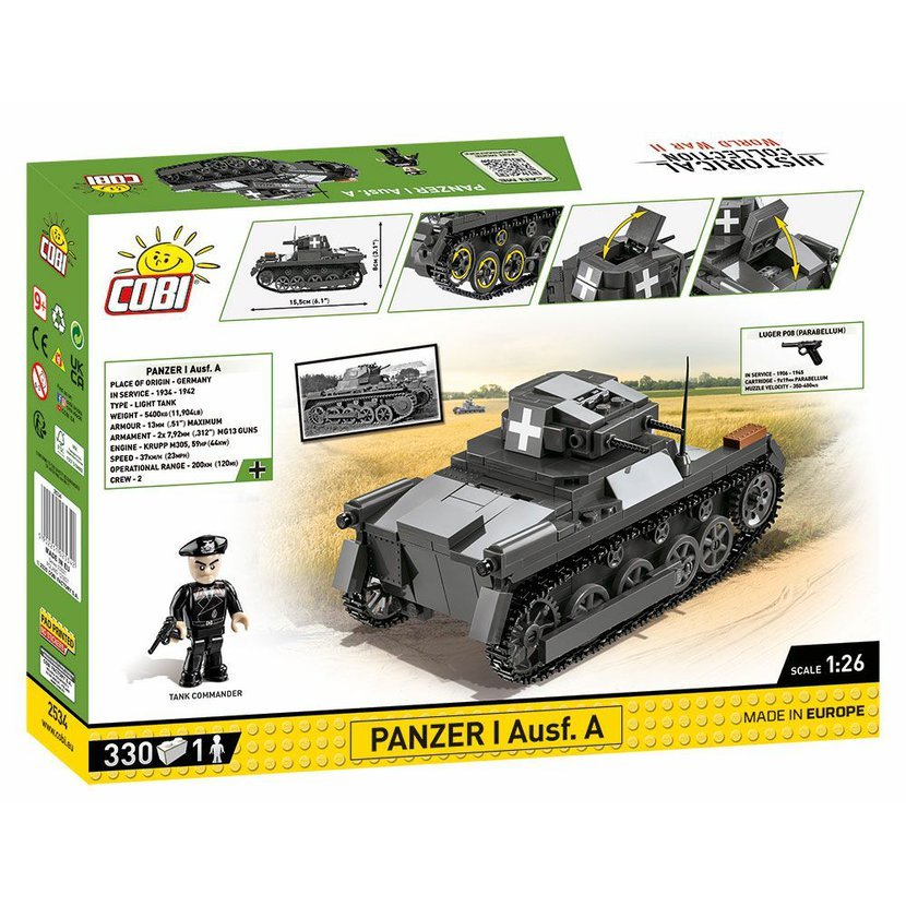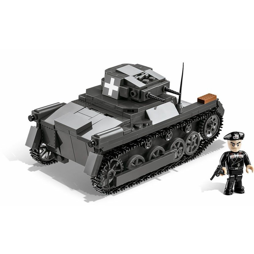 Postavte si model německého lehkého tanku Panzer I Ausf A, používaného na začátku 2. světové války. V letech 1934 - 1939 bylo vyrobeno asi 2 000 kusů. Tanky PzKpfw I byly použity mimo jiné při invazi do Polska a ve Španělské občanské válce. Model má pohyblivé prvky, jako jsou pásy, kola, věž a otvírací poklopy. Sada obsahuje postavu německého velitele tanku vyzbrojeného pistolí Parabellum. Za povšimnutí stojí také detailní značení na baretu tankisty. Model je potištěn kvalitními stálobarevnými tisky a nenajdete v něm žádné samolepky. Balení obsahuje 330 kostek stavebnice a 1 figurku německého vojáka.