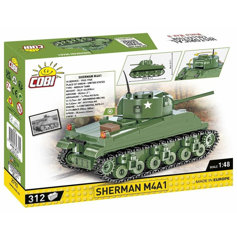 Postavte si model M4 Sherman, což byl hlavní americký střední tank z 2. světové války. Vyráběný v letech 1942 - 1945 se stal nejznámějším americkým tankem vůbec. Během války se dynamicky rozvíjela. Byl vybaven 75mm kanónem. Munice a hořlavý motor dělaly Shermany zpočátku snadným cílem pro těžší německé tanky. Teprve po doladění konstrukce se mohly role obrátit. Celkem bylo vyrobeno přibližně 49 000 všech verzí Shermanu. Tank byl používán mj. armádou USA, Velké Británie, Polska, Francie a SSSR. Měl pověst spolehlivého, snadno vyrobitelného a dobře vyzbrojeného tanku. Balení obsahuje 312 kostek stavebnice. Neobsahuje figurky.
