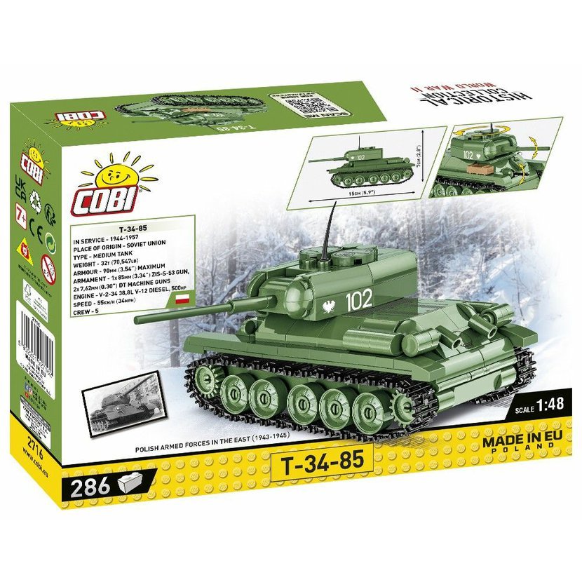 Postavte si model T-34-85 je sovětský střední tank vyráběný v letech 1941 až 1958. Během druhé světové války hrál roli hlavního tanku sovětských obrněných sil. Díky své extrémně jednoduché konstrukci bylo velmi snadné jej vyrobit, používat a opravovat. Mnoho historiků uznává, že tank T-34-85 se podílel na vítězství spojeneckých států ve druhé světové válce. Vozidlo využívaly desítky zemí ještě mnoho let po skončení celosvětového konfliktu. Balení obsahuje 286 kostek.