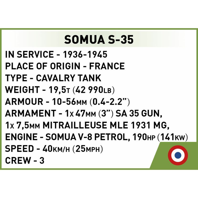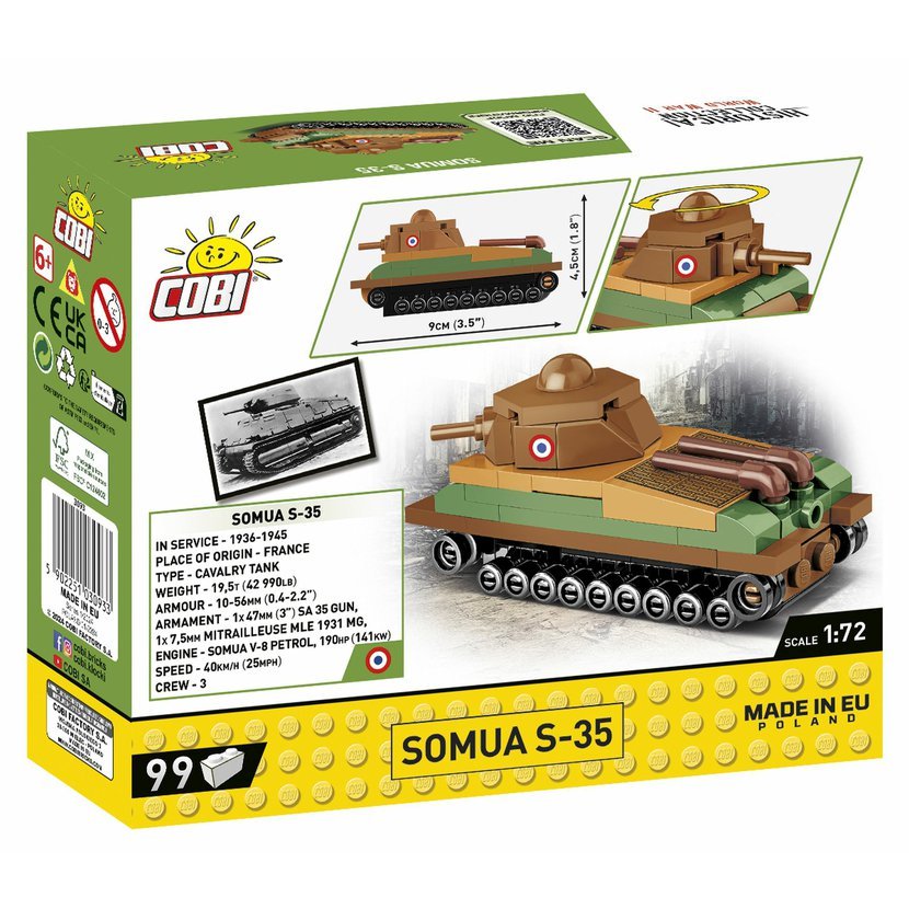 Postavte si model Somua S-35, francouzský střední tank z 2. světové války. Tank měl velmi charakteristickou siluetu a elektricky otočnou věž, ve které byla umístěna výzbroj tanku. Byl vybaven 47milimetrovým dělem, měl poměrně silné pancéřování a vynikající mobilitu. Byl to jeden z nejlepších francouzských tanků v době vypuknutí 2. světové války! Balení obsahuje 99 kostek stavebnice a model je v měřítku 1:72.