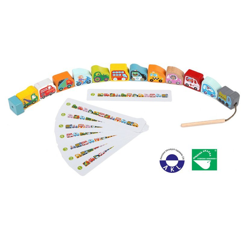 Navlékací dopravní prostředky jsou ideální hrou pro procvičení jemné motoriky, trpělivosti a paměti. Sada nabízí 12 dřevěných navlékacích prvků s dopravní tematikou, jednu tkaničku s dřevěným kolíčkem na prostrkování na jedné straně a zarážkou na druhé straně a 8 předloh s různě seřazenými tematickými prvky, podle kterých děti jednotlivé dílky navlékají. Zdatnější hráči si pak mohou předlohu jen prohlédnout a zkusit navlékat zpaměti a vytvářet si tak svůj vlatní příběh.