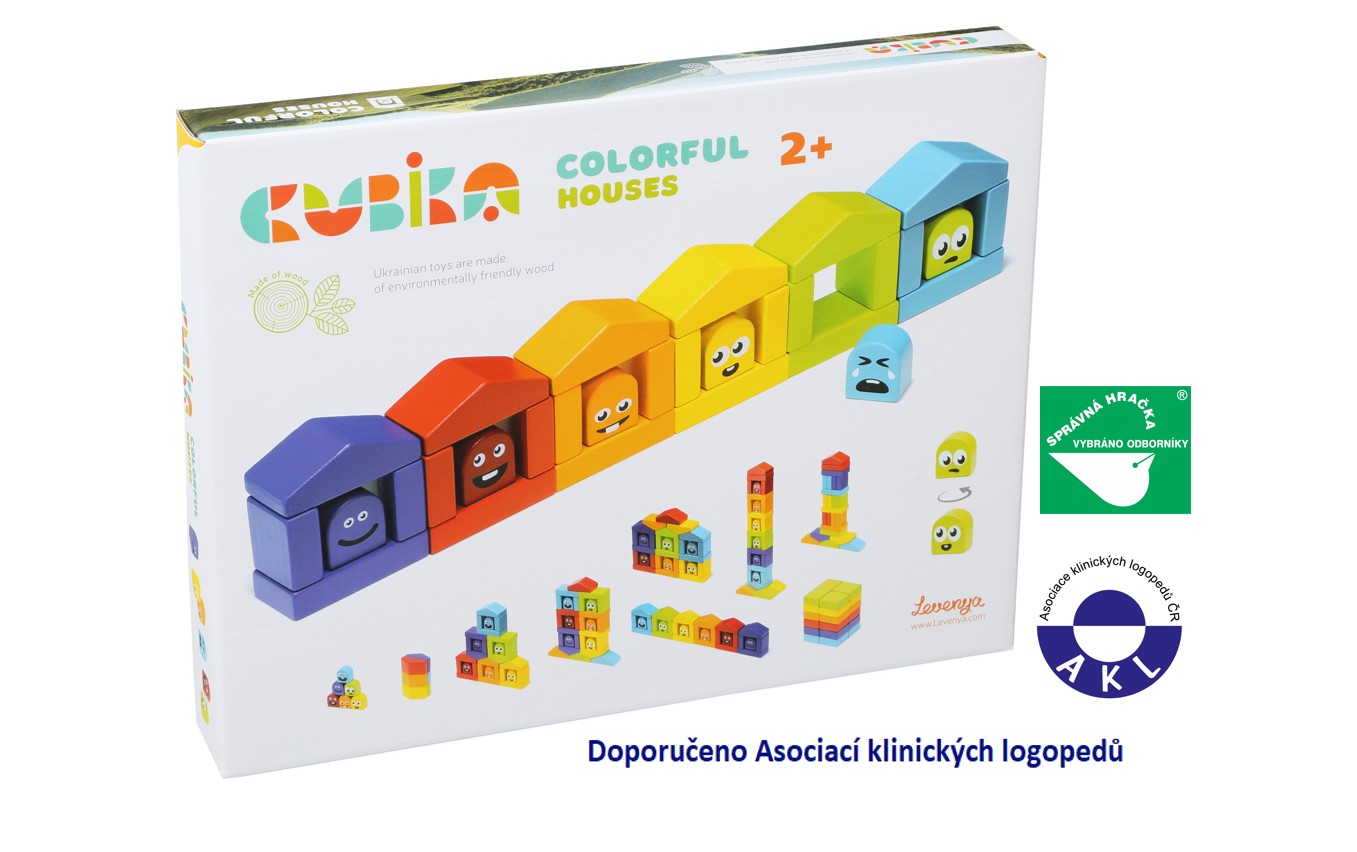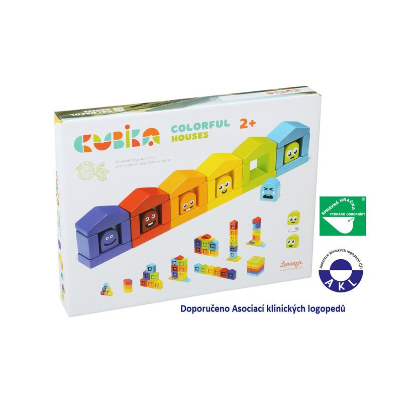 CUBIKA je nová značka dřevěných hraček vyrobených pouze z ekologicky pěstovaného dřeva s velmi precizním opracováním a líbivým designem. Dřevěná stavebnice se 30 barevnými prvky včetně kostiček s emotikony nabízí mnoho zábavy. Každý z šesti domečků má svého obyvatele v příslušné barvě, které je třeba správně do domečku umístit. Děti se tak formou zábavné hry učí poznávat barvy. Fantazii při stavitelské činnosti se zde však meze nekladou. Z kostiček lze hravě postavit různé architektonické komplexy. Sortiment hraček značky CUBIKA pomáhá dětem rozvíjet především senzomotorické schopnosti a dovednosti, logické myšlení, kreativitu, představivost a různé poznávací znalosti. Hračky jsou vyrobeny z nejkvalitnějšího javoru a buku a k barvení se používají též vysoce kvalitní barvy na vodní bázi, které jsou naprosto bezpečné pro děti a nemají žádný zápach. Všechny výrobky této značky mají německý certifikát TÜV a jsou vyrobeny dle evropské normy pro bezpečnost hraček EN 71. Nevhodné pro děti do 2 let. Vyrobeno v Evropě.