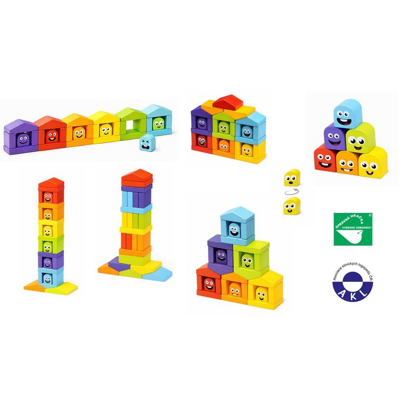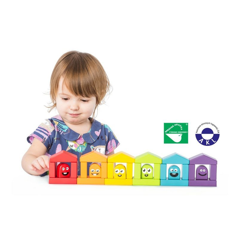 Dřevěná stavebnice se 30 barevnými prvky včetně kostiček s emotikony nabízí mnoho zábavy. Každý z šesti domečků má svého obyvatele v příslušné barvě, které je třeba správně do domečku umístit. Děti se tak formou zábavné hry učí poznávat barvy. Fantazii při stavitelské činnosti se zde však meze nekladou. Z kostiček lze hravě postavit různé architektonické komplexy.