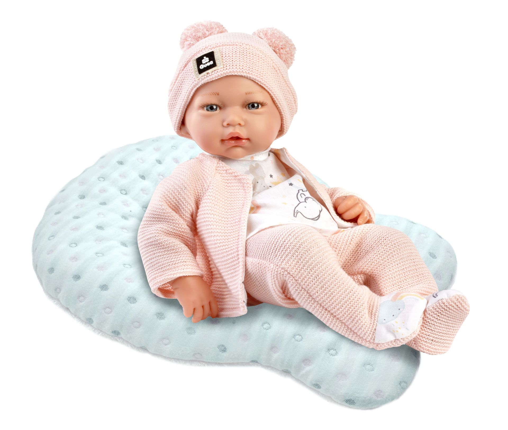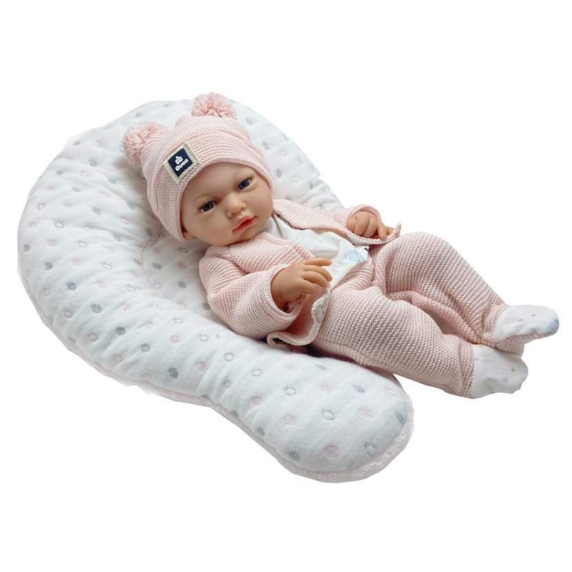 Panenka miminko bez zvuku s měkkým látkovým tělem. Ruce a nohy jsou k tělu přichyceny kloubem. Miminko je polohovací a může i sedět. Velikost 36 cm. Ručně vyrobeno ve Španělsku, baleno v dárkové krabici. Doporučený věk od 3 let.