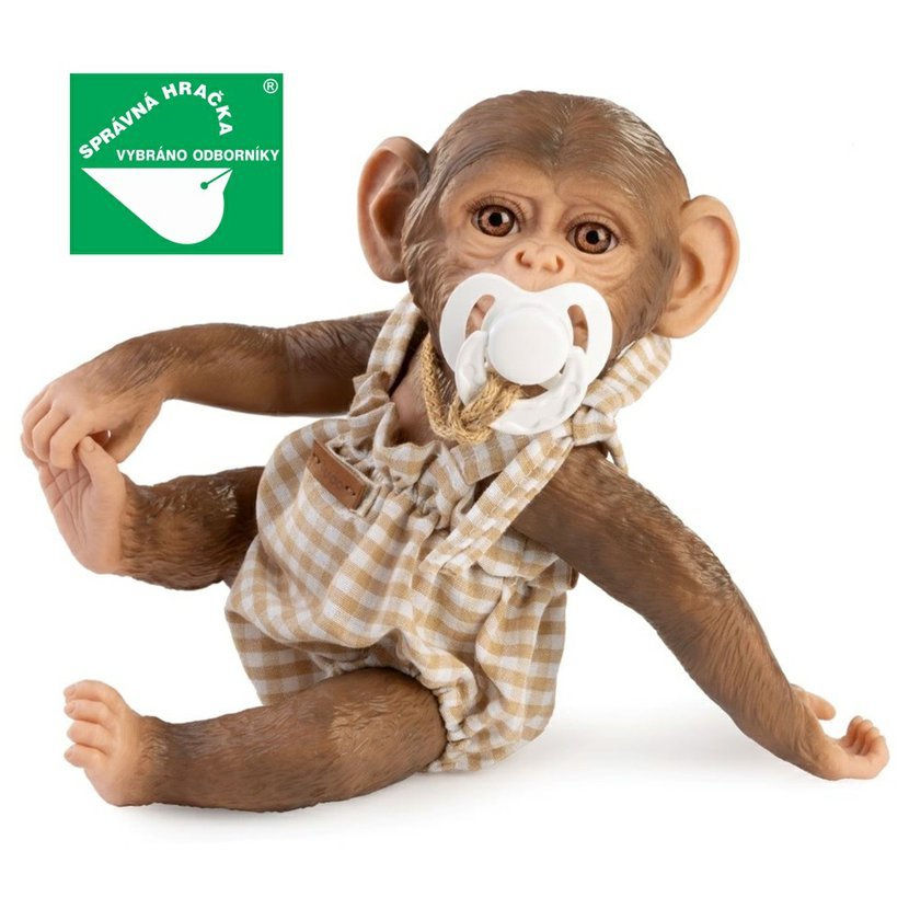 Veselé a roztomilé opičí miminko bez zvuku s vinylovým tělem s možností koupání, na kterém je zachycen věrohodně každý detail tohoto zvířecího mláďátka včetně různých záhybů, kromě pohlaví. Opičku lze koupat, ale je potřeba dát pozor, aby se jí nenamočily řasy. Odlepené řasy nejsou pak důvodem k reklamaci. Ruce a nohy jsou k tělu přichycené kloubem. Opičí miminko je polohovací a může i sedět nebo se dá pověsit za ruce nebo nohy. Dudlík v balení slouží pouze jako doplněk. Velikost 32 cm. Ručně vyrobeno ve Španělsku, baleno v dárkové krabici. Doporučený věk od 3 let.