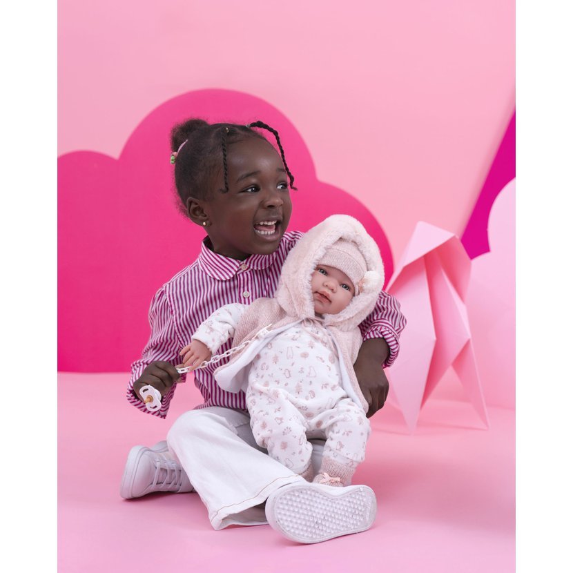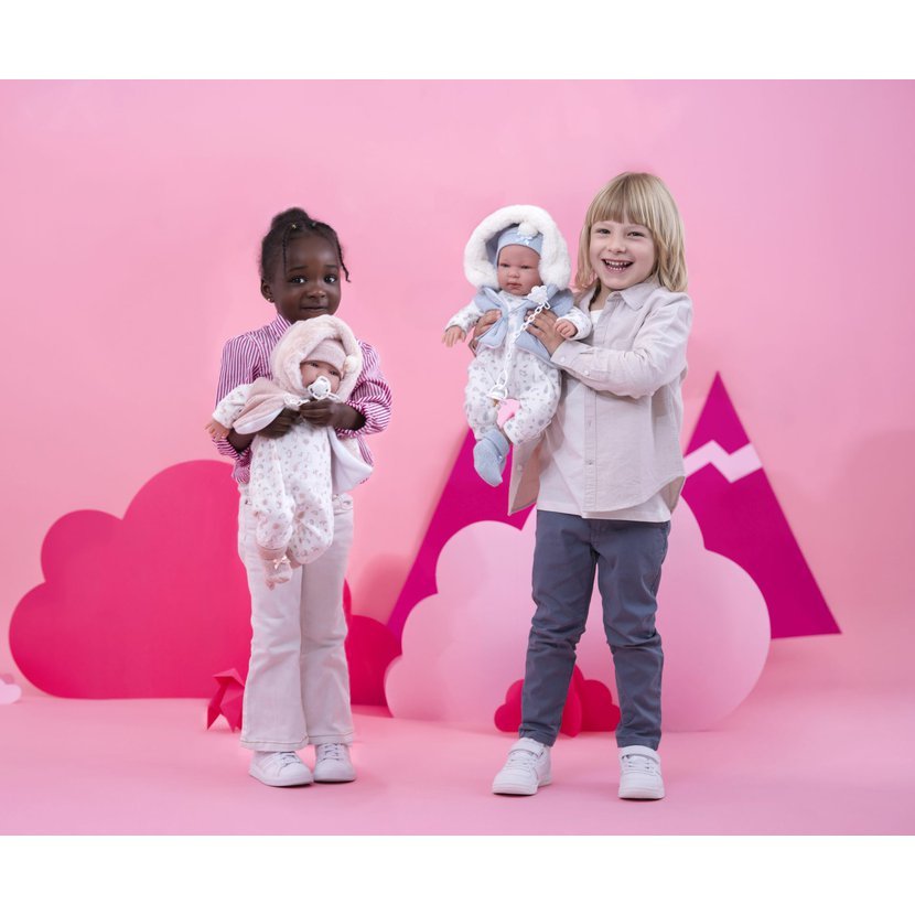Zvuková, ručně vyrobená panenka s měkkým látkovým tělem, která po zatlační na hrudník začne vydávat zvuky. Velikost 44 cm, materiál: vinyl, bavlna. Součástí balení je 3 x knoflíková baterie LR44. Vyrobeno ve Španělsku. Doporučený věk od 3 let.