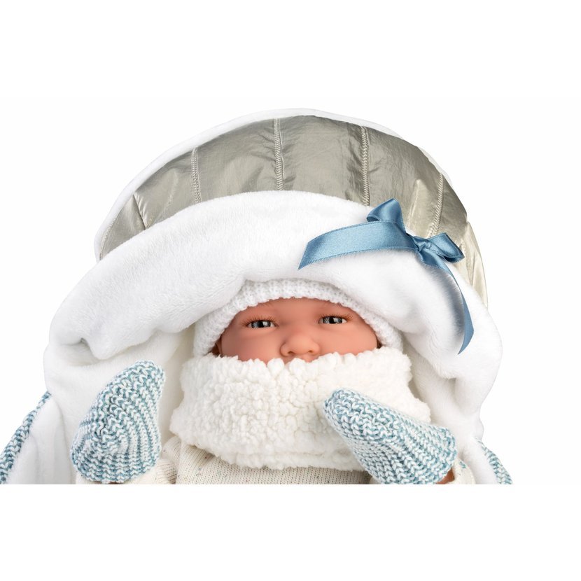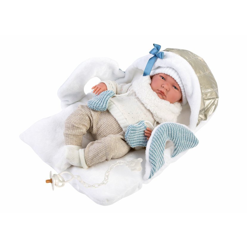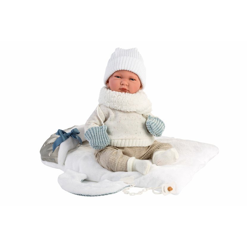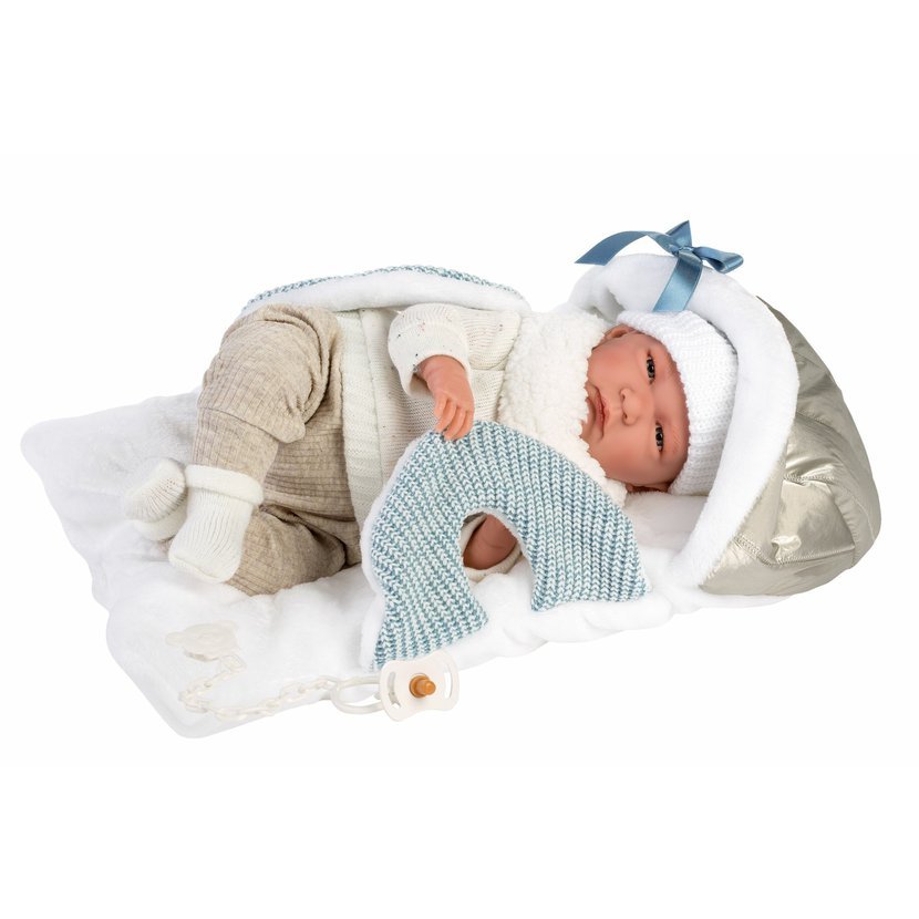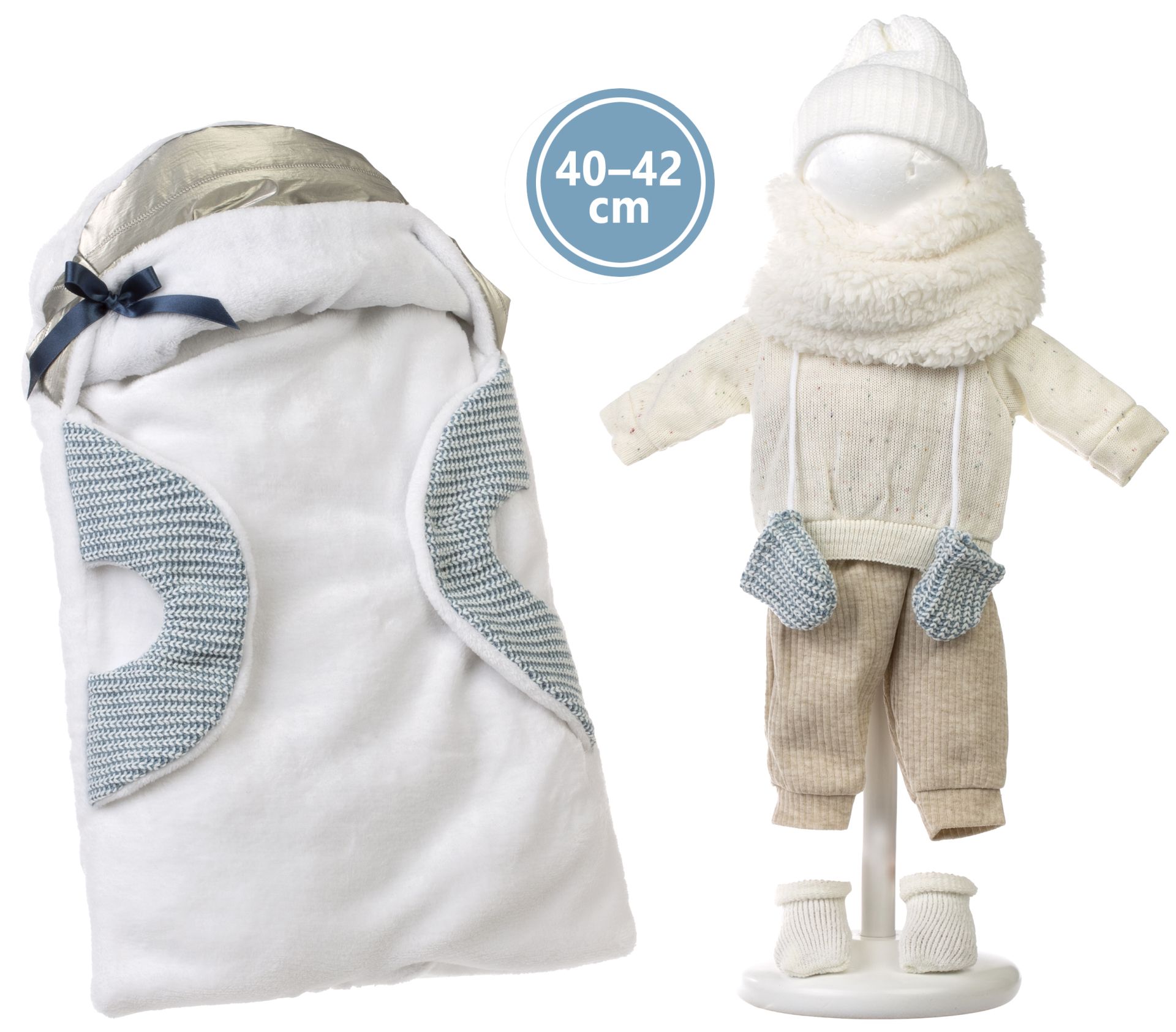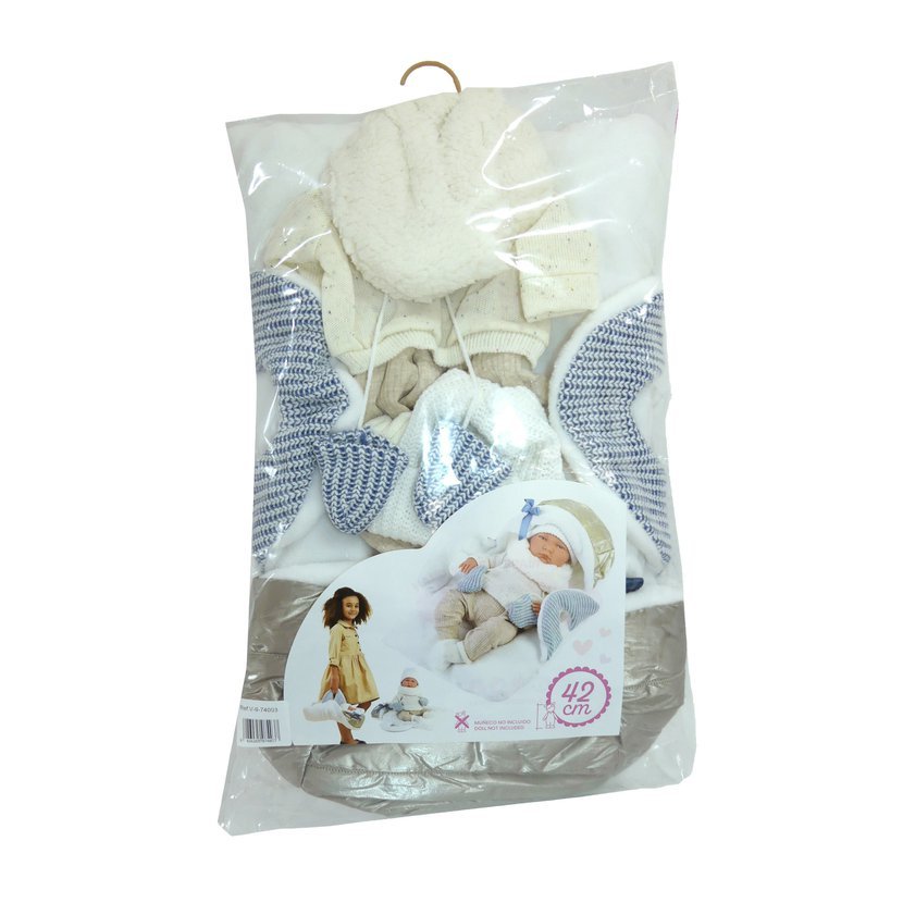 6dílný obleček s podložkou s kapucí a popruhy pro přenášení pro panenku miminko NEW BORN Llorens velikosti 40-42 cm. Vyrobeno ručně ve Španělsku, baleno v igelitovém obalu s plastovým ramínkem. Doporučený věk od 3 let.