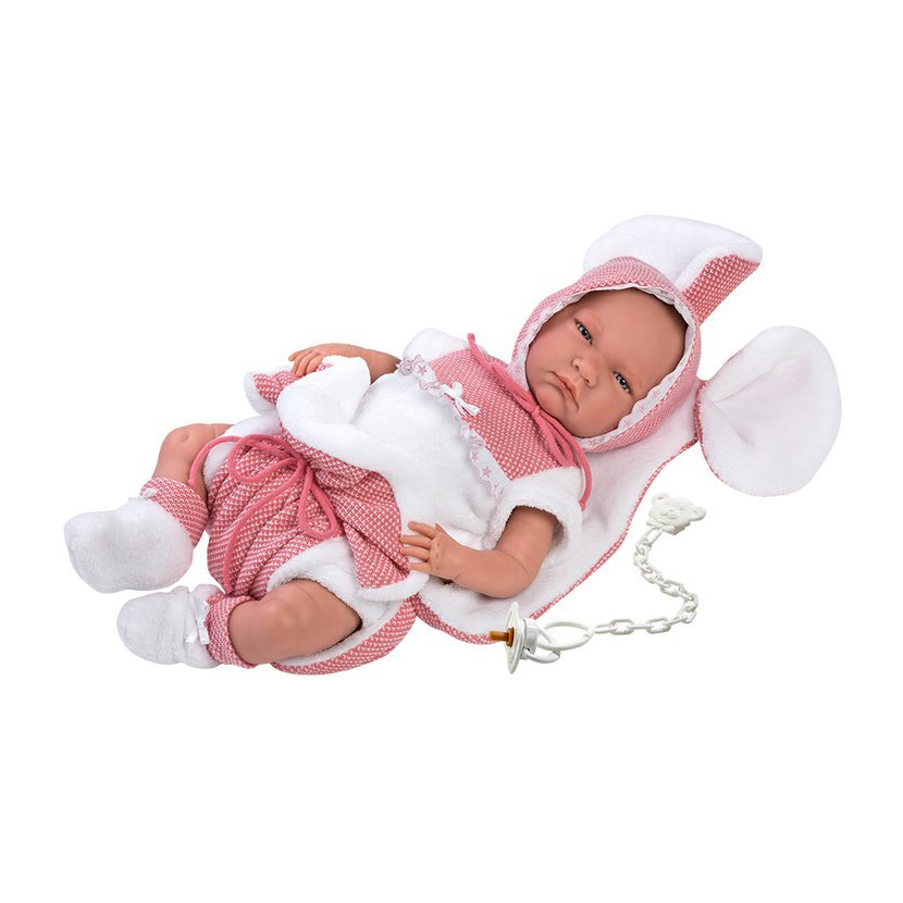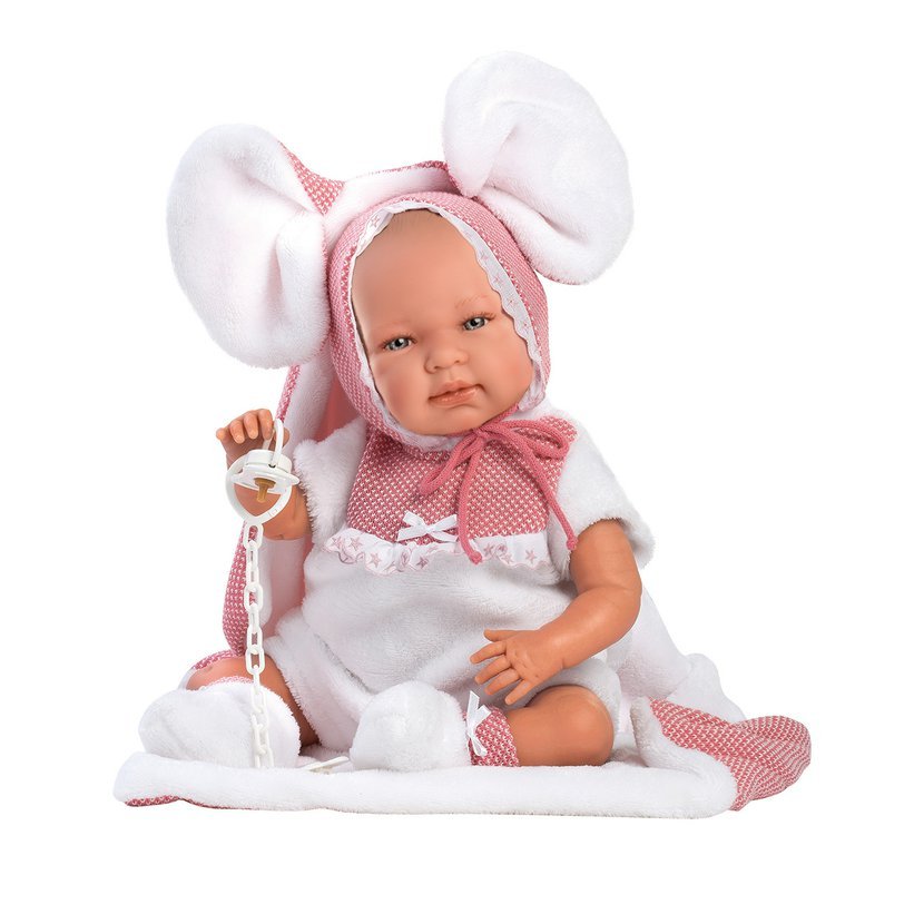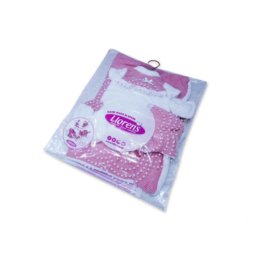 3dílný obleček s ozdobnou podložkou s ouškama pro panenku miminko NEW BORN Llorens velikosti 40-42 cm. Vyrobeno ve Španělsku, baleno v igelitovém obalu s plastovým nebo kartonovým ramínkem. Doporučený věk od 3 let.
