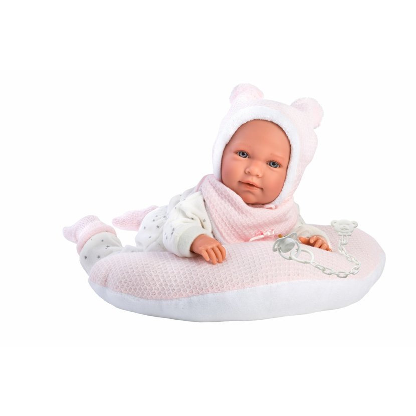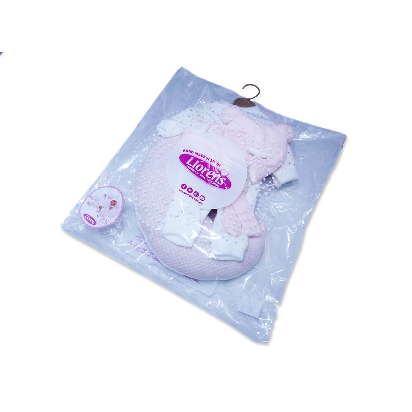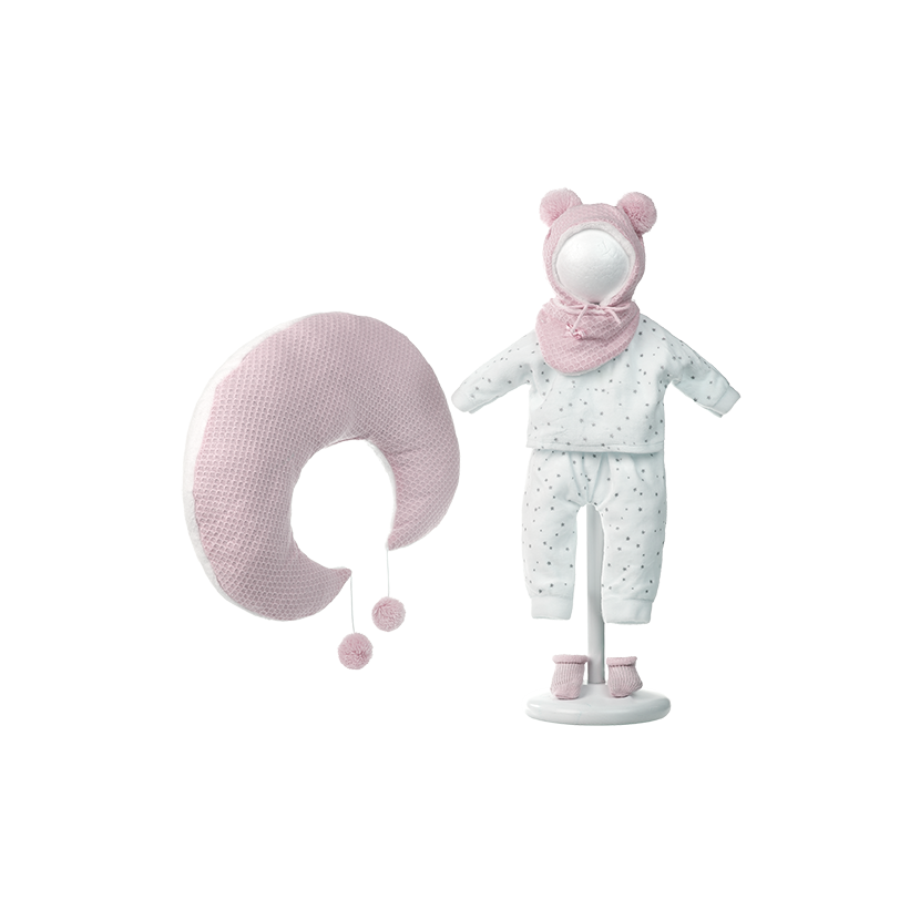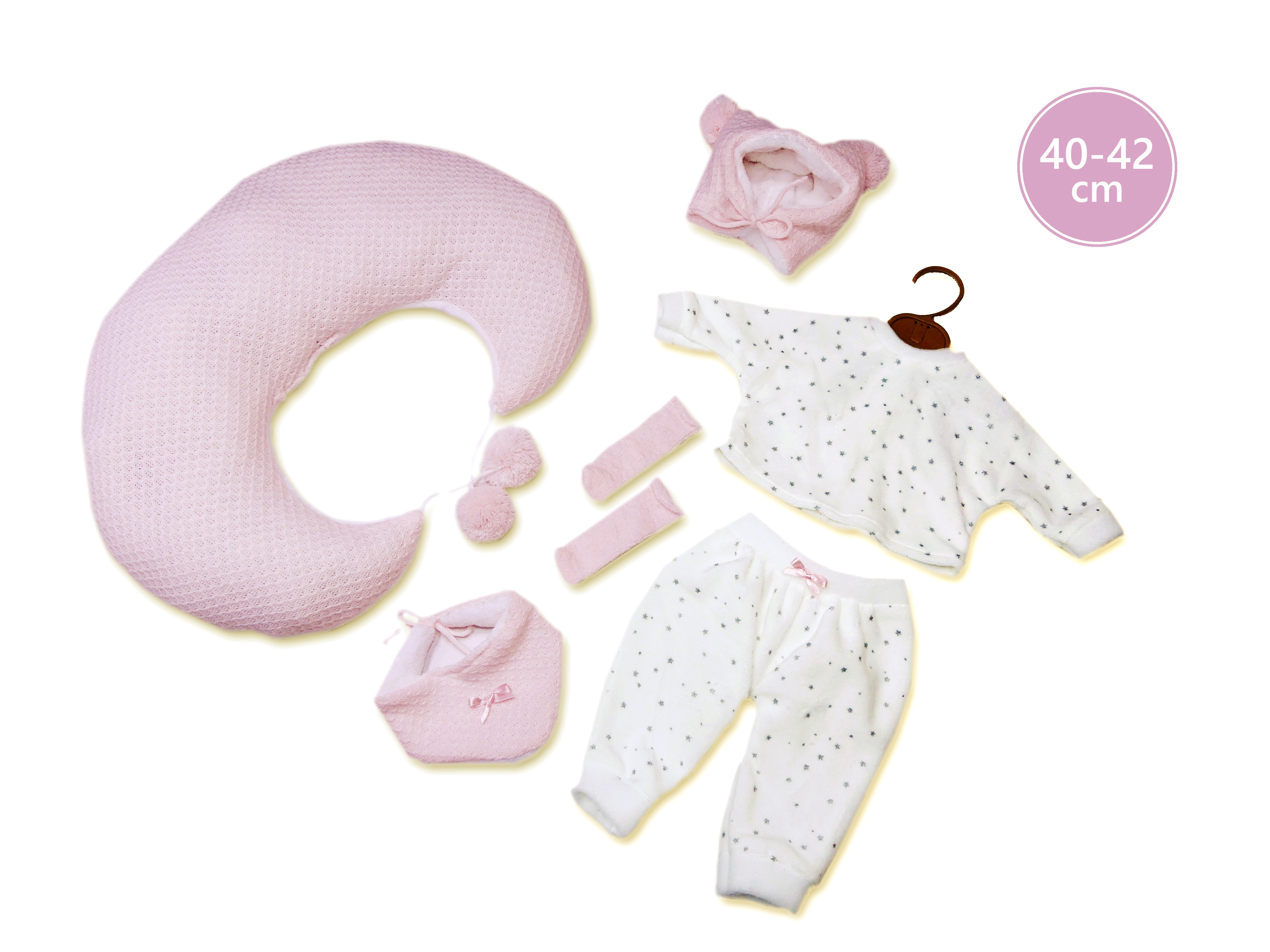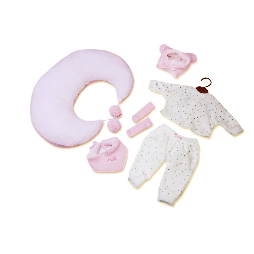 5dílný obleček s kojícím polštářem pro panenku miminko NEW BORN Llorens velikosti 40-42 cm. Vyrobeno ve Španělsku, baleno v igelitovém obalu s plastovým nebo kartonovým ramínkem. Doporučený věk od 3 let.
