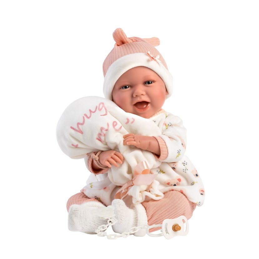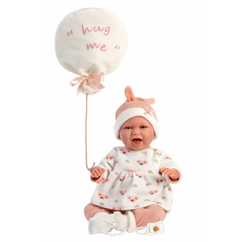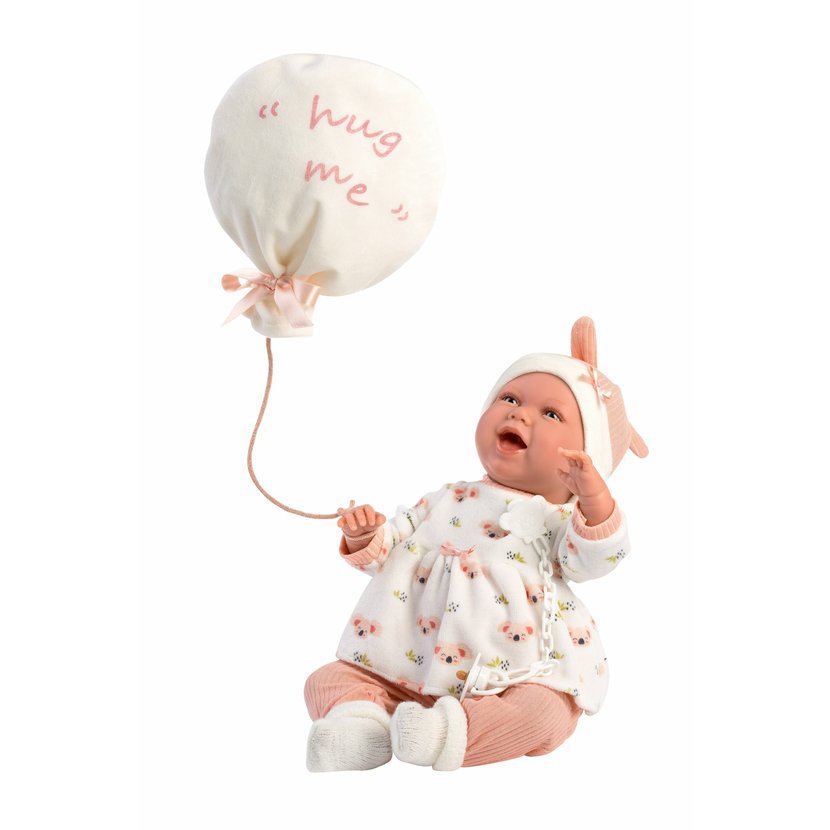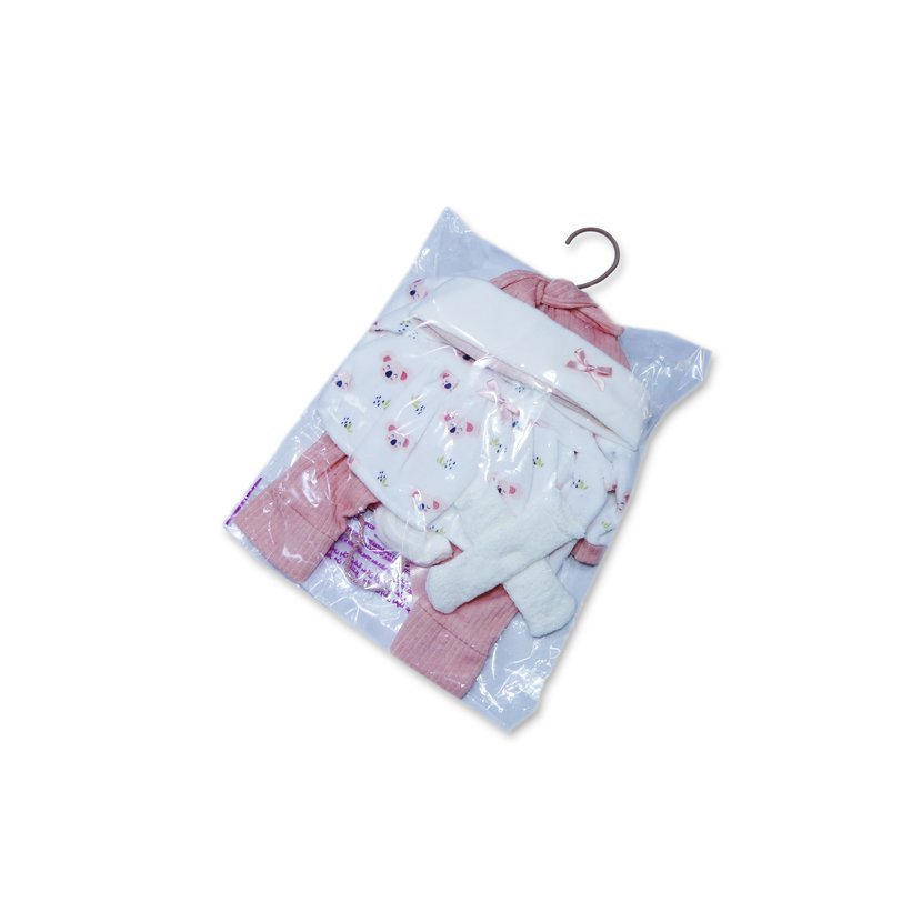 4dílný obleček se sametovým muchlíkem ve tvaru balonku pro panenku miminko NEW BORN Llorens velikosti 40-42 cm. Vyrobeno ve Španělsku, baleno v igelitovém obalu s plastovým nebo kartonovým ramínkem. Doporučený věk od 3 let.