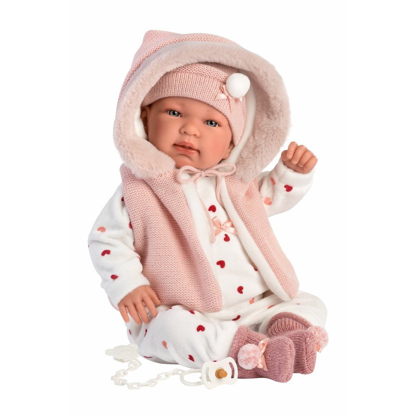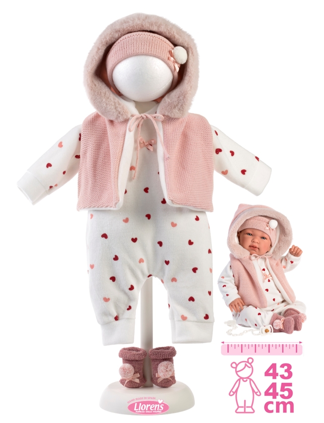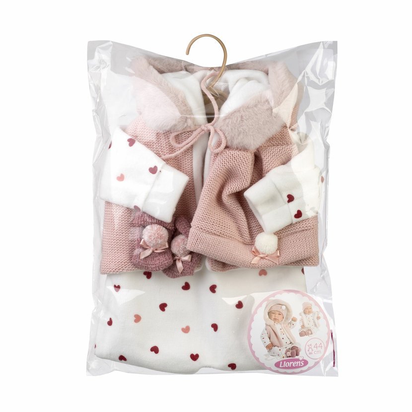 4dílný obleček pro panenku miminko NEW BORN Llorens velikosti 43-45 cm. Vyrobeno ručně ve Španělsku, baleno v igelitovém obalu s ramínkem. Doporučený věk od 3 let.