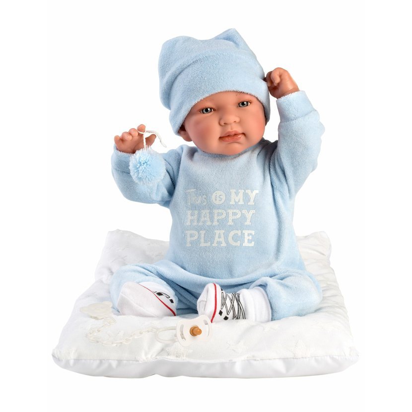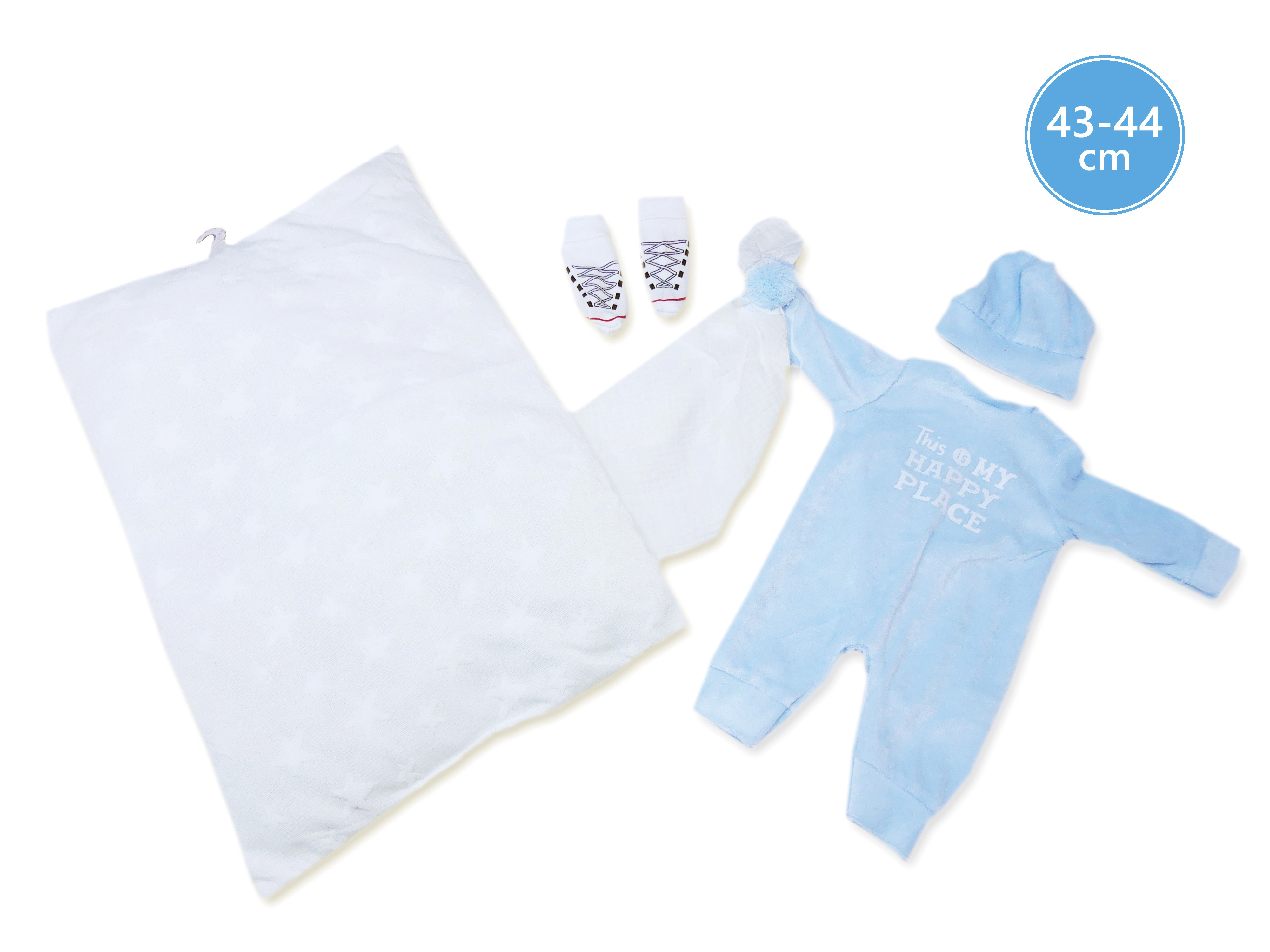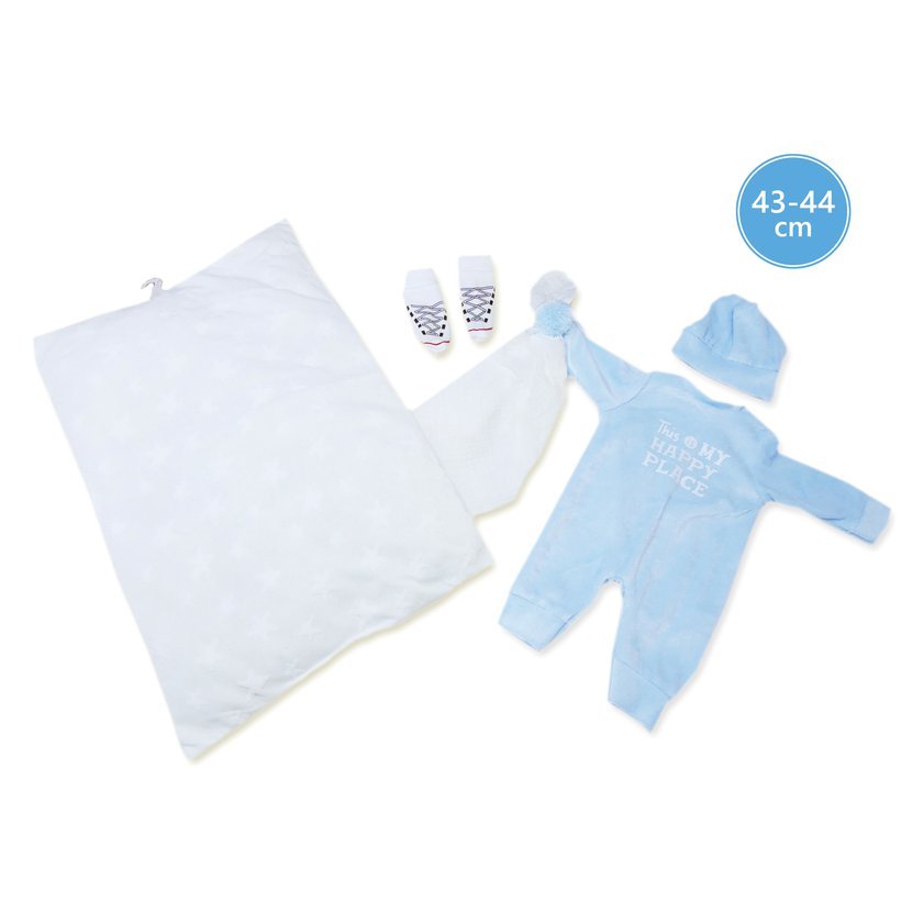 3dílný obleček s polštářem využitelným jako podložka a muchlacím kapesníčkem s bambulkou pro panenku miminko NEW BORN Llorens velikosti 43-44 cm. Vyrobeno ve Španělsku, baleno v igelitovém obalu s plastovým nebo kartonovým ramínkem. Doporučený věk od 3 let.