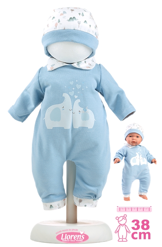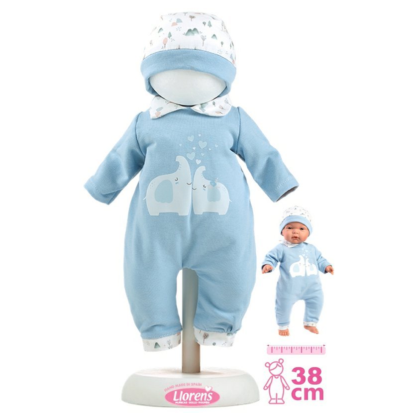 2dílný obleček pro panenku Llorens velikosti 38 cm. Vyrobeno ručně ve Španělsku, baleno v igelitovém obalu s ramínkem. Doporučený věk od 3 let.