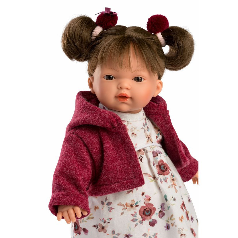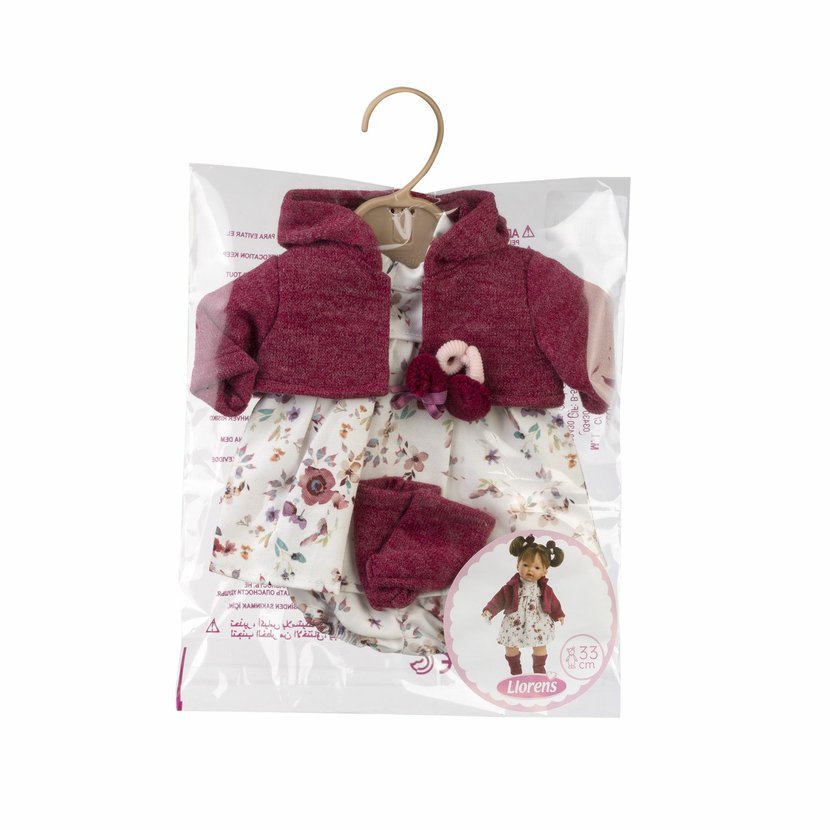 4dílný obleček s ozdobnými gumičkami do vlásků pro panenku Llorens velikosti 33 cm. Vyrobeno ručně ve Španělsku, baleno v igelitovém obalu s plastovým ramínkem. Doporučený věk od 3 let.