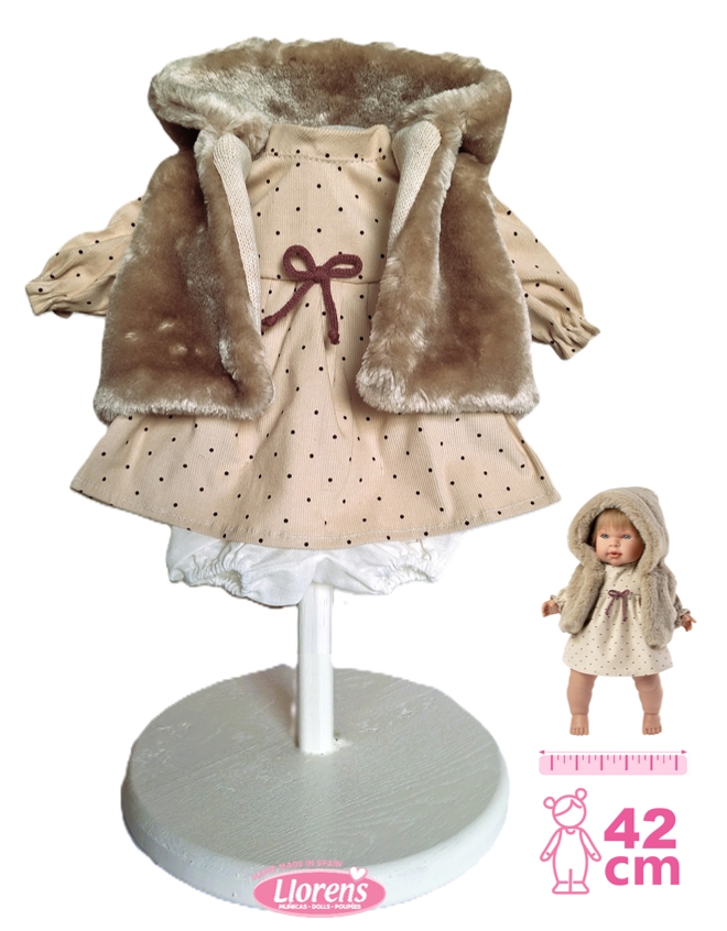 3dílný obleček pro panenku Llorens velikosti 42 cm. Vyrobeno ručně ve Španělsku, baleno v igelitovém obalu s ramínkem. Doporučený věk od 3 let.