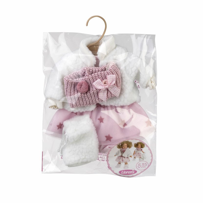 5dílný obleček s ozdobnou gumičkou s mašlí do vlásků pro panenku Llorens velikosti 35 cm. Vyrobeno ručně ve Španělsku, baleno v igelitovém obalu s plastovým ramínkem. Doporučený věk od 3 let.