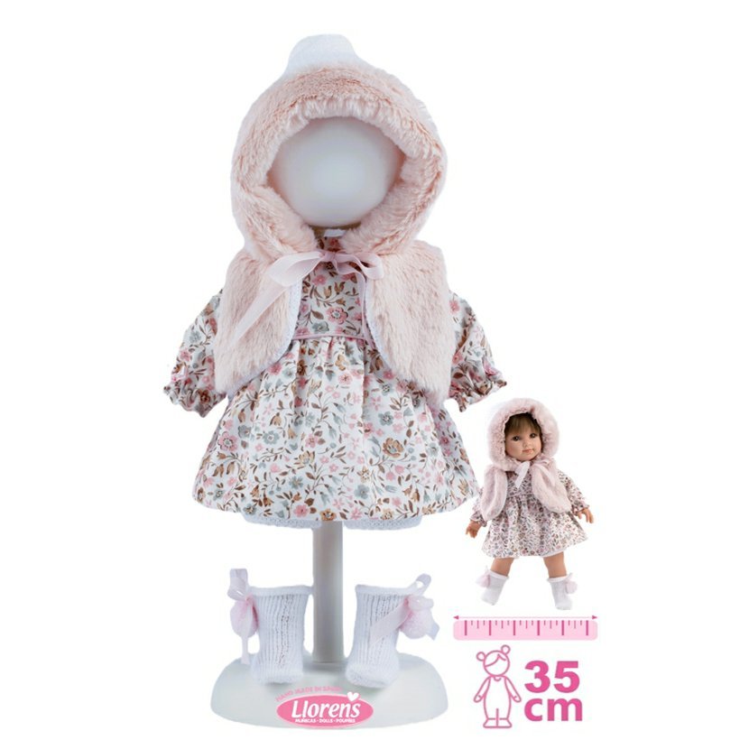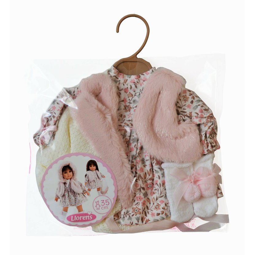 5dílný obleček pro panenku Llorens velikosti 35 cm. Vyrobeno ručně ve Španělsku, baleno v igelitovém obalu s ramínkem. Doporučený věk od 3 let.
