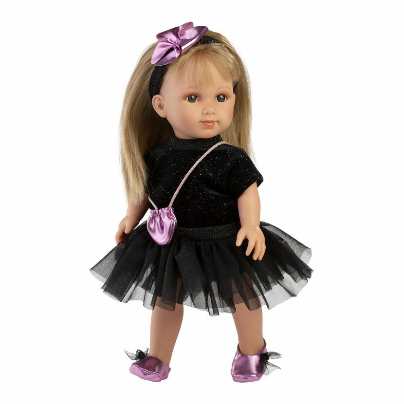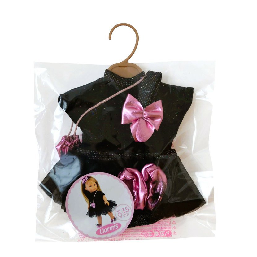 5dílný set: 3 kusy oblečení, ozdobná gumička s mašlí do vlásků a kabelka pro panenku Llorens velikosti 35 cm. Vyrobeno ručně ve Španělsku, baleno v igelitovém obalu s ramínkem. Doporučený věk od 3 let.