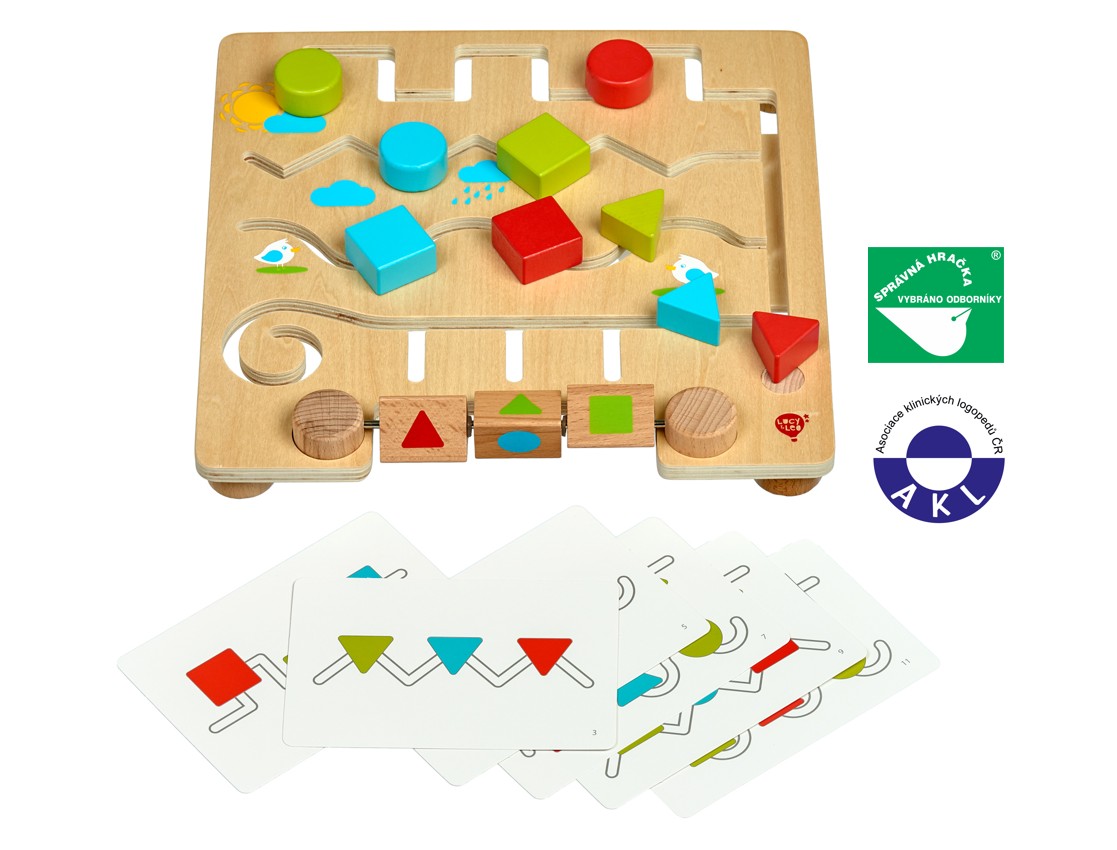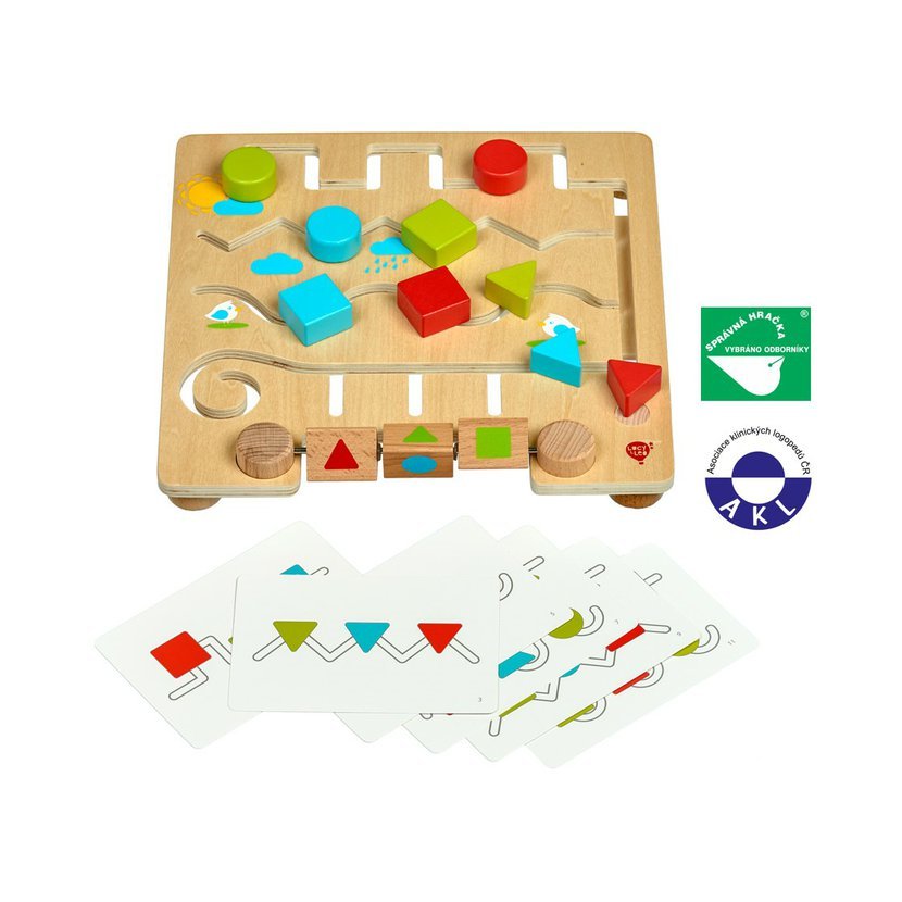 Geometrické tvary s předlohami je dřevěné bludiště, které dětem pomáhá rozvíjet logické myšlení a senzomotorické dovednosti. Dřevěná herní deska s hladkým povrchem má řadu různých klikatých cestiček s barevnými dřevěnými tvary. Děti se snaží daný tvar posouvat po cestičce tak, aby se shodoval s tvarem na jednom ze tří rotujících bloků umístěných ve spodní části hrací desky, nebo pracují s 12 papírovými předlohami (6 oboustranných karet), které nabízejí další úkoly. Hra je ideální i na cesty. Rozměr hrací desky 30 x 30 x 5 cm. Tato hračka je označována jako Montessori pomůcka.