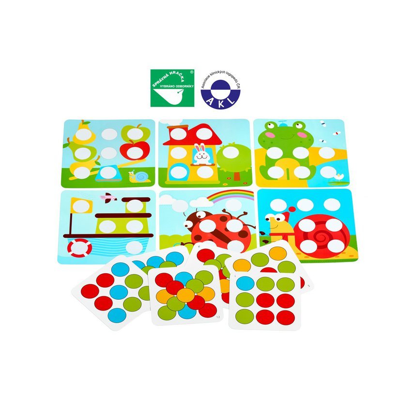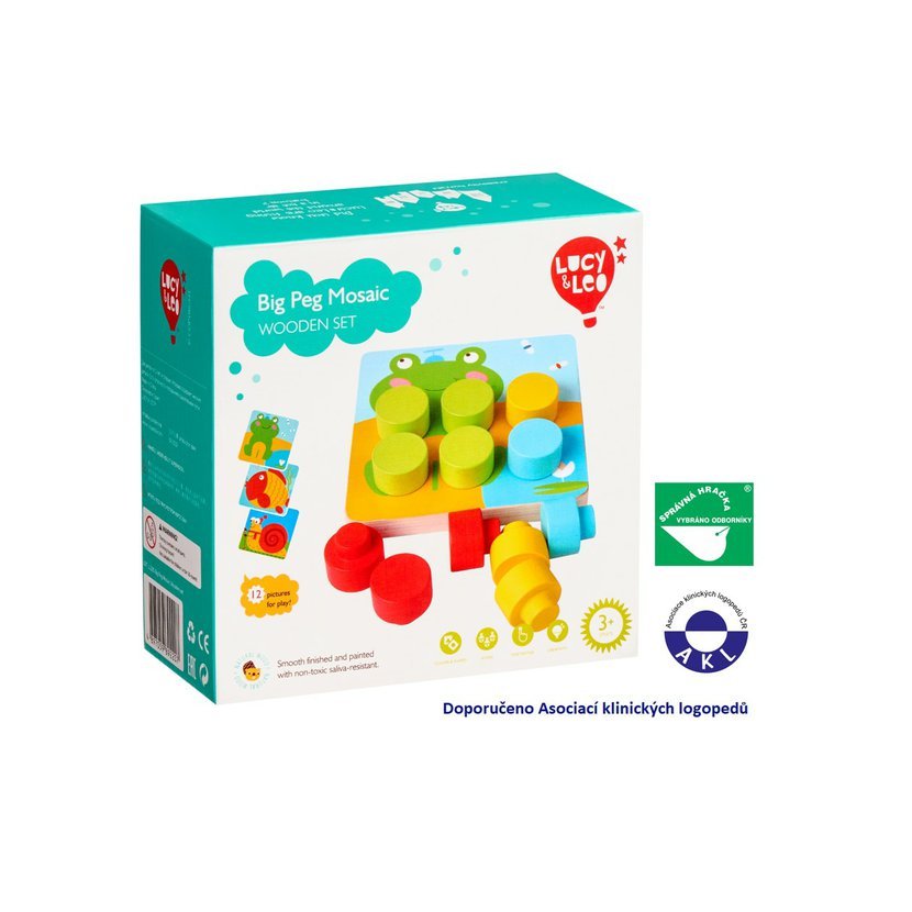 Barevná mozaika s velkými kolíky je dřevěná hra, rozvíjející jemnou dětskou motoriku a tvořivé myšlení. Balení obsahuje 14 velkých dřevěných barevných kolíků, 12 oboustranných předloh: 6 perforovaných barevných obrázků s veselými motivy a 6 barevných předloh i s vrstvenými variantami pro poskládání kolíků, dřevěný podstavec s otvory na kolíky. Dítě si buď vybere jednu z barevných předloh s veselými obrázky, kterou položí na dřevěný podstavec a začne obrázek vyplňovat barevnými kolíky, nebo se snaží na hrací ploše kolíky poskládat podle druhých obrázkových předloh, které se na hrací desku neumísťují. Tato hračka je označována jako Montessori pomůcka. Rozměry podstavce 14 x 14 x 1,5 cm.