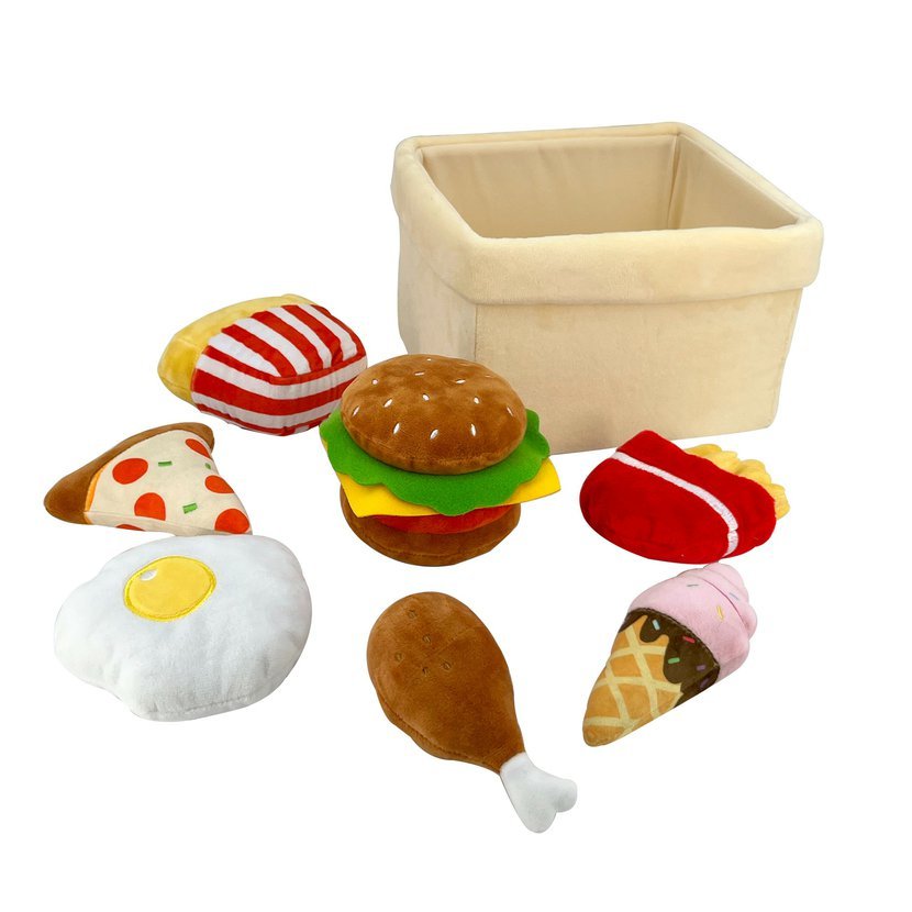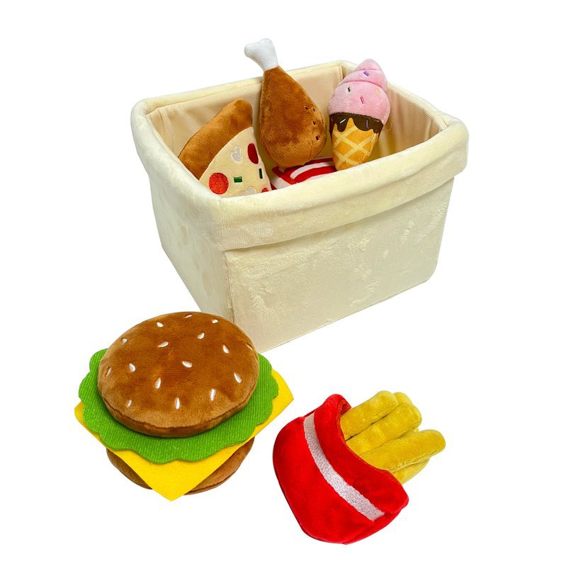 Plyšový košík s fastfoodovým jídlem je nezbytným doplňkem při hraní si na kuchaře nebo prodej jídla v restauraci, ale najde také své využití i v dětské kuchyňce. Vyšívaná tematická plyšová hračka z velmi kvalitní plyše. Sada obsahuje košík a 7 imitací fastfoodových pokrmů: hamburger, jednu porci hranolek, trojúhelník pizzy, kuřecí stehno, volské oko, muffin a zmrzlinu. Použité materiály: Vrchní látka a výplň 100% polyester, vnitřní výztuže košíku - plast. Ruční praní a čištění vlhkým hadříkem. Vhodné pro děti od 2 let.