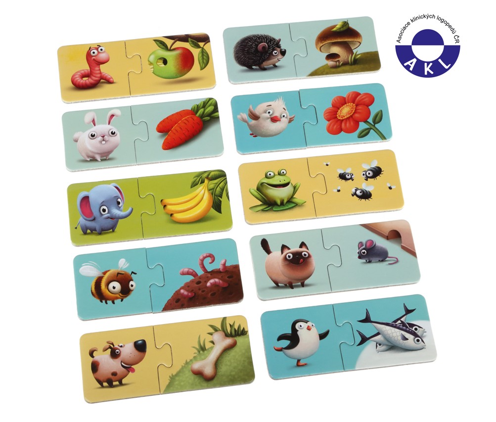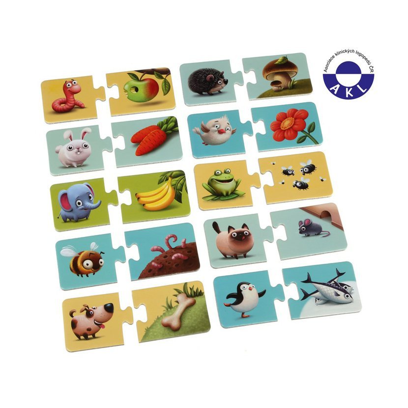 Víte které zvířátko co jí? V krabičce naleznete 20 velkých pevných puzzlů tvořících 10 samostatných dvojic kartiček, které spolu tematicky souvisejí. Jedna polovina kartiček obsahuje ilustrace jednotlivých zvířátek a na druhé polovině kartiček je vyobrazeno jídlo, kterým se živí. Cílem je vytvořit správné kombinace a nasbírat co nejvíce párů.