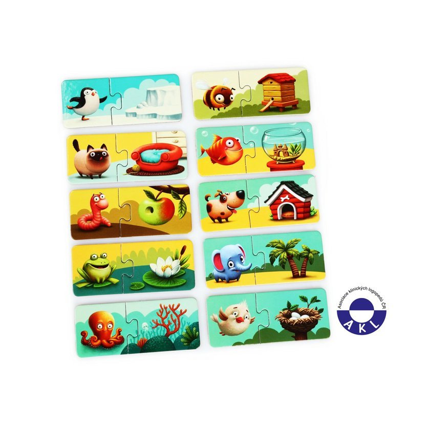Poznáte kde které zvířátko bydlí? V krabičce naleznete 20 velkých pevných puzzlů, tvořících 10 samostatných dvojic kartiček, které spolu tematicky souvisejí. Jedna polovina kartiček obsahuje ilustrace jednotlivých zvířátek a na druhé polovině kartiček je vyobrazeno jejich nejčastější obydlí. Cílem je vytvořit správné kombinace a nasbírat co nejvíce párů.