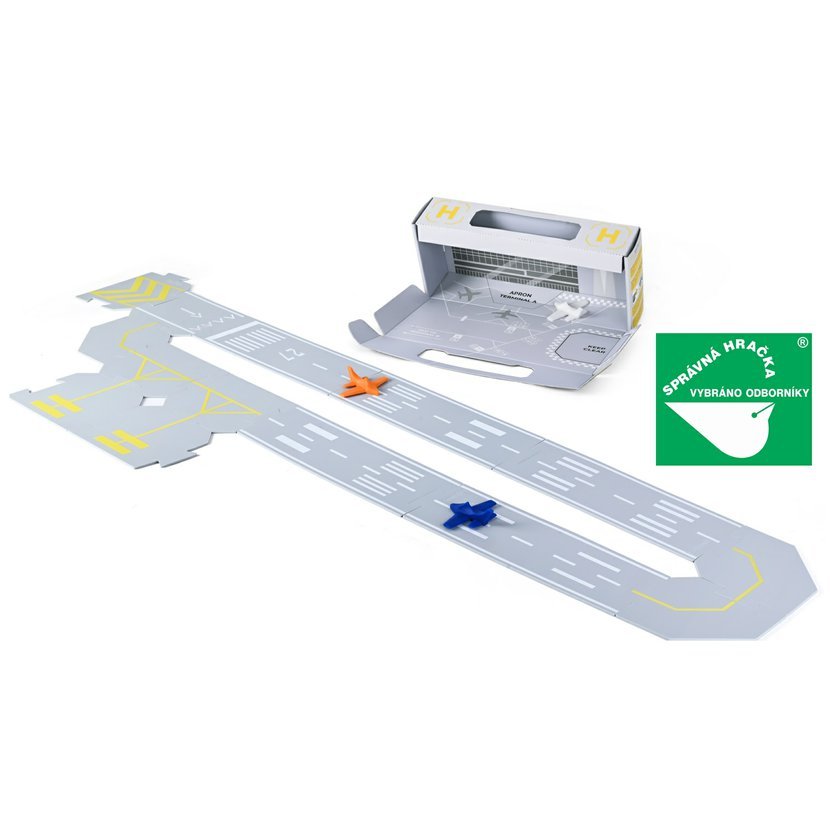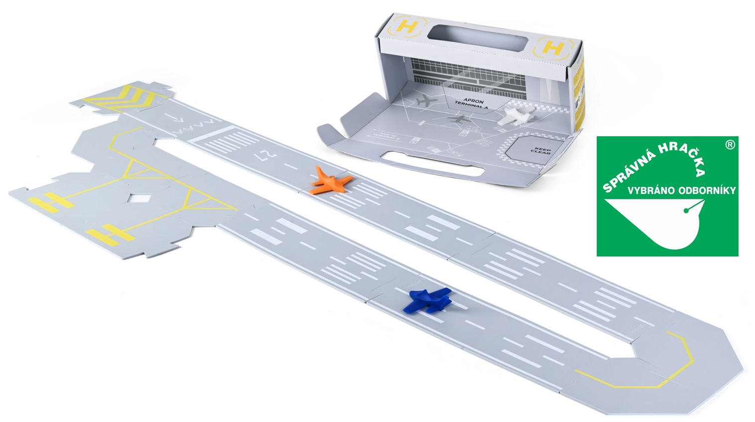 SADA LETIŠTĚ o celkové délce 2,6 metrů a šířce dráhy 10 cm se skládá ze 14 silikonových oboustranných prvků: 5x rovné pojezdové dráhy (celková délka 1,5 m), 9x odbavovací plochy včetně stání pro taxi. Jednotlivé díly mají oboustranný potisk, který dětem umožňuje větší rozmanitost staveb. V sadě jsou také 3 silikonová ergonomicky tvarovaná letadla (bílé letadlo ve tmě svítí). Součástí hračky je i funkční kartonová krabice s vnitřním potiskem letiště, která zároveň slouží i jako úložný box. Vhodné pro děti od 1 roku.